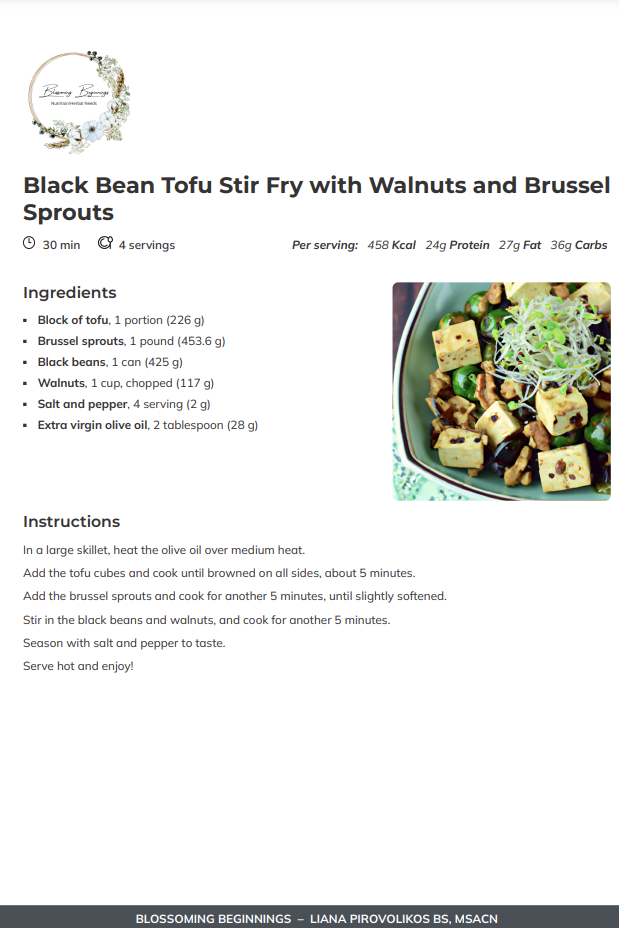 Benefits Nutrient-dense, plant-powered recipe packed with protein, fiber, and healthy fats. The tofu and black beans offer a complete source of plant-based protein, while Brussels sprouts support hormone balance and detoxification. Walnuts add a satisfying crunch and are rich in omega-3s for brain and reproductive health. Liana Pirovolikos 8/15/24 Liana Pirovolikos 8/15/24 Gluten-Free Pumpkin Goji Waffles Read More Vegan Liana Pirovolikos 8/15/24 Vegan Liana Pirovolikos 8/15/24 Goji Berry & Cashew Energy Bars Read More